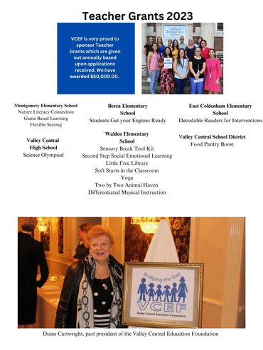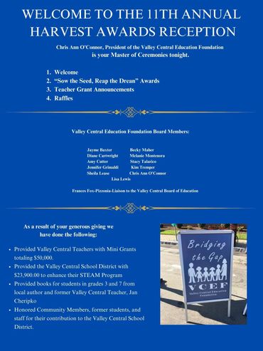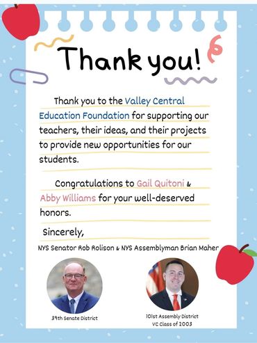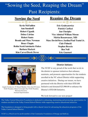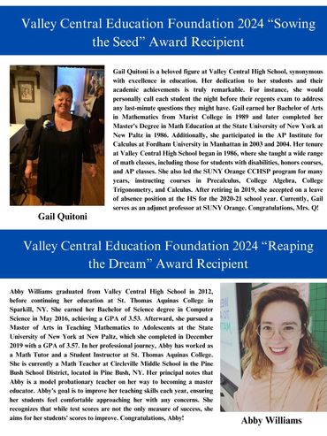 The "Sowing the Seed" award is presented to someone in the Valley Central Community who has gone above and beyond to support student learning in an outstanding way. This year the award will be presented to Gail Quitoni, Retired Math Teacher.