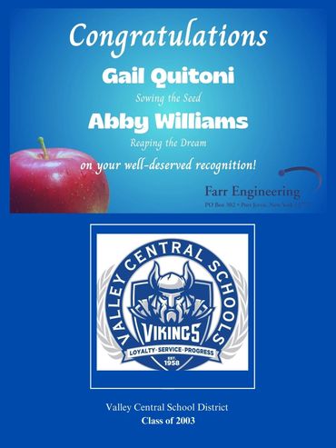 The "Reaping the Dream" award is presented to a Valley Central School graduate who has taken the skills they have learned in Valley Central and applied them to their lives in a meaningful way. This year the award will be presented to Gail Quitoni Math Student Abby Williams.